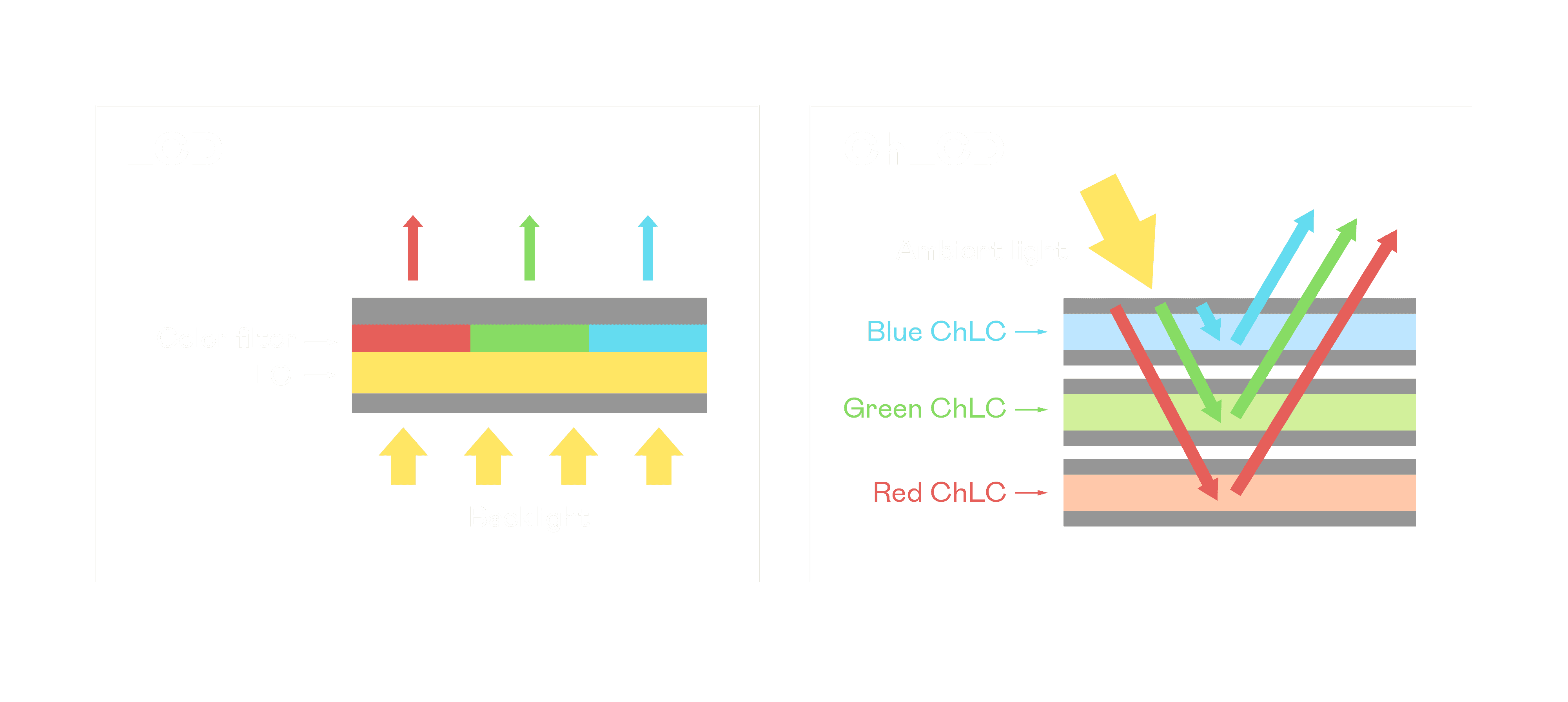ChLCD 胆固醇液晶就如同纸张一样,,,透过反射环境光来显示影像,,,因此长时间观看不易造成人眼视觉疲劳,,可达到护眼效果。。。。当处于户外阳光下使用,,LCD 影像容易失真而不易观看,,,但胆固醇液晶仍可维持较佳的影像品质。。
